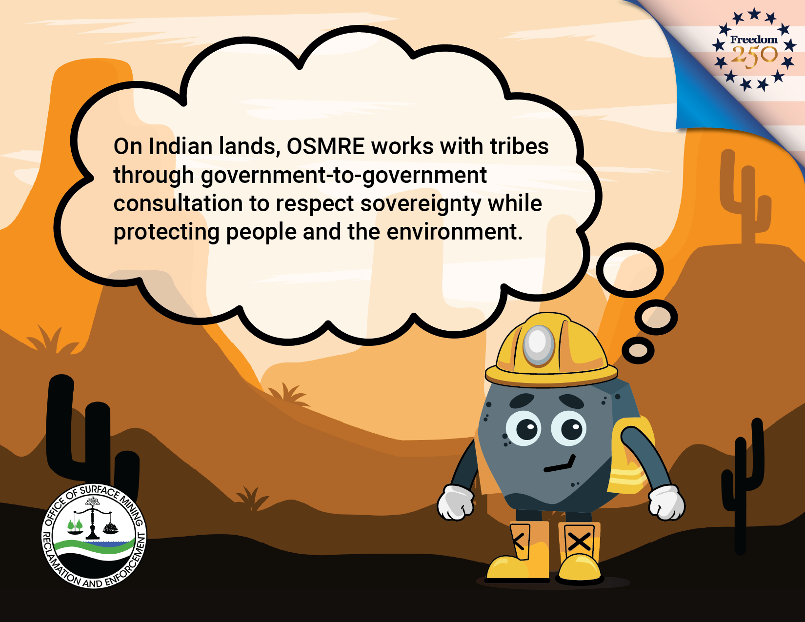 On Indian lands, OSMRE acts as the regulatory authority unless a tribe has an approved primacy program. We carry out these responsibilities while consulting with tribal leadership through a government-to-government process. This work reflects a long-standing federal responsibility to consult with tribes and respect sovereignty while ensuring environmental protection and public safety.