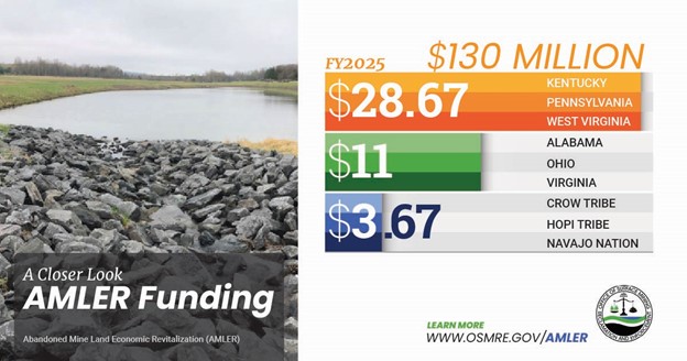 For FY2025, the Abandoned Mine Land Economic Revitalization (AMLER) Program provided $130 million to eligible states and tribes to support projects helping spur job creation and long-term community benefits.